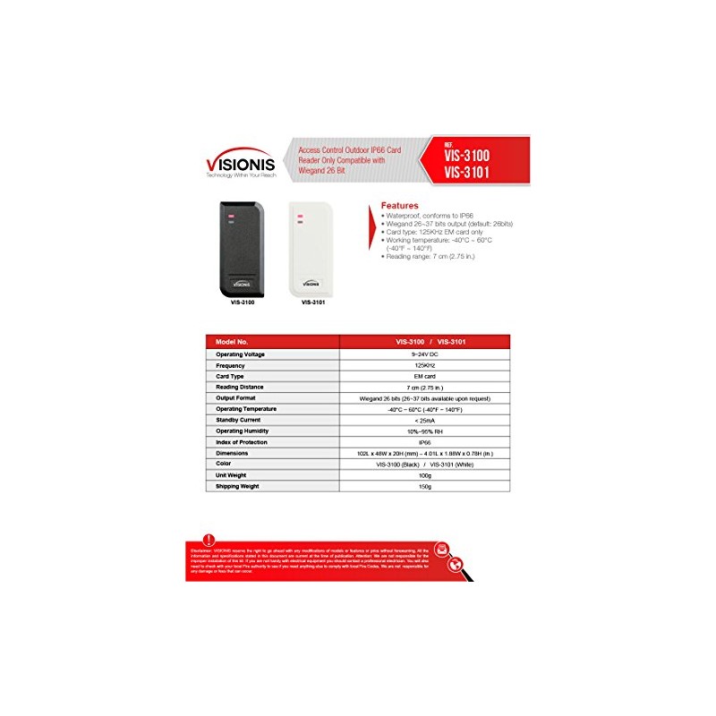 - (1) VIS-3100 Access Control Black Outdoor IP66 Card Reader