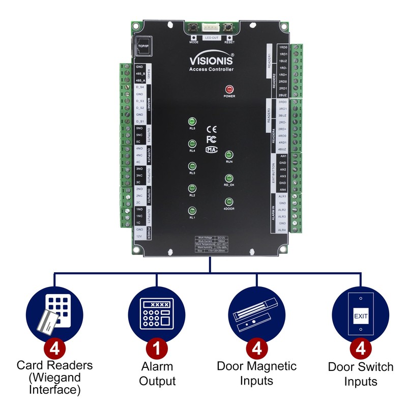 Visionis VS-AXESS-4D-ETL-PCB Four Door Access Control Panel controller Board TCP/IP Wiegand with Software Included, 10,000 Users