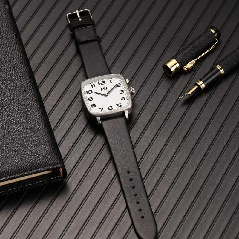 VISIONU Square German Talking Clock with Alarm Function Voice Function Time and Date White Dial Black Leather Strap TGSW-1704G, Strap.