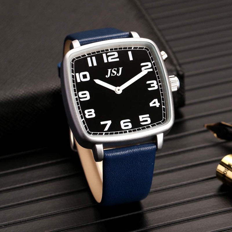 VISIONU TGSW-1712G Square German Speaking Watch with Alarm Function, Voice Function Time and Date, Black Dial, Blue Leather Strap, Strap.