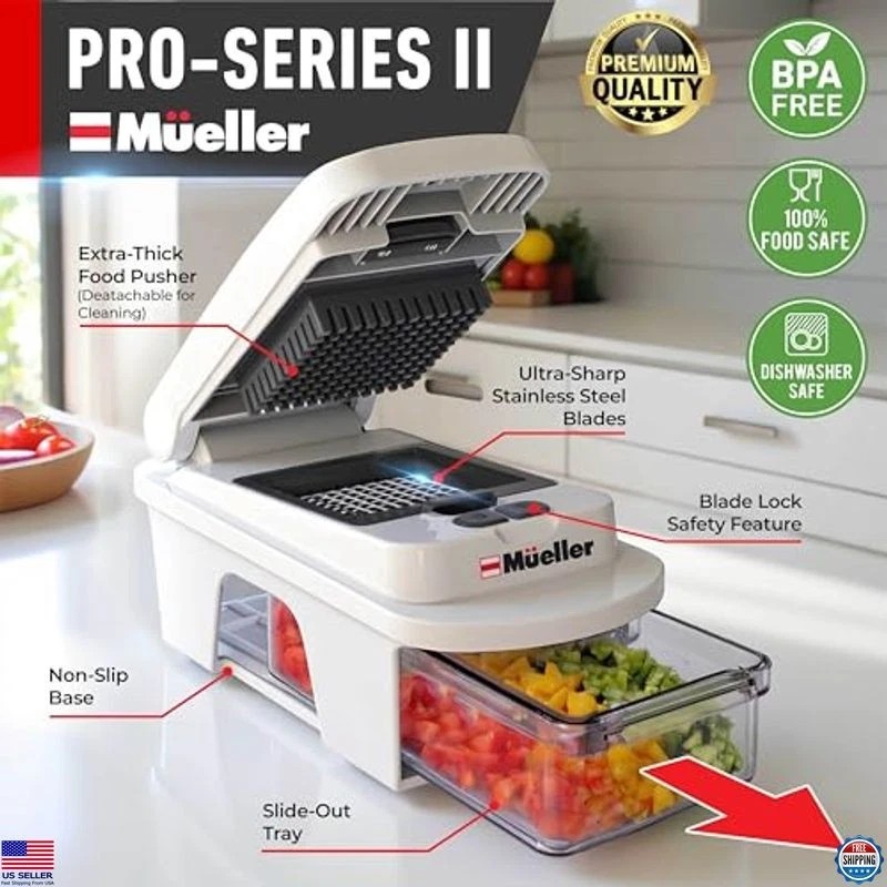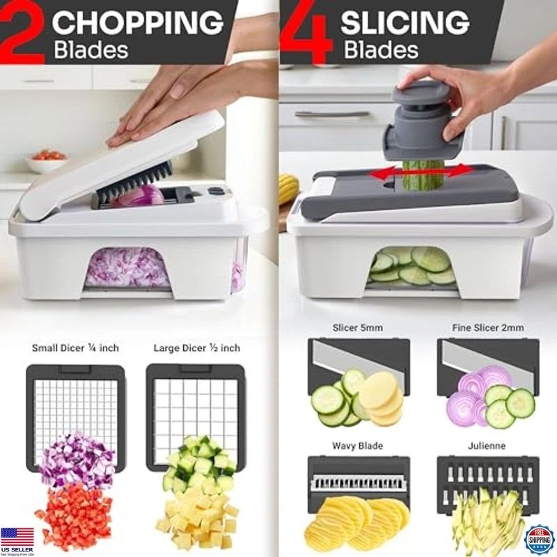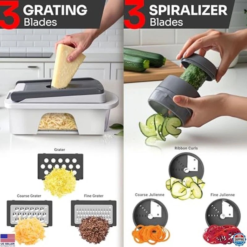 Mueller Pro-Series All-in-One, 12 Blade Mandoline Slicer for Kitchen, Food Chopper, Vegetable Slicer and Spiralizer, Cutter, Dicer, Grater, Kitchen Gadgets Sets with Container, White Sand/Gray