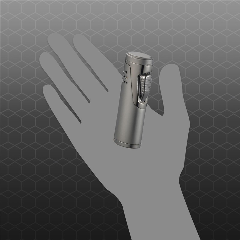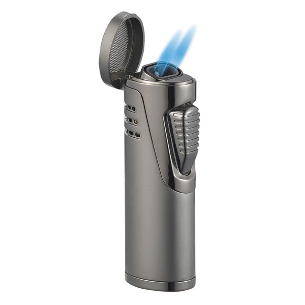 - DUAL FLAME LIGHTER: A dual torch that emits two powerful and wind-resistant flames. With a dual action ignition, simply flip the lid and push the button to ignite the flames. Not only can it be ready to use to light your cigar, but it is a great tool for camping or traveling outdoors.