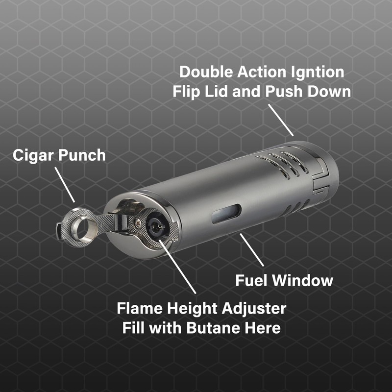 - FLAME HEIGHT ADJUSTER, FUEL WINDOW: A flame height adjuster can be found at the base of this lighter that can adjust the intensity of the flames. Use caution when adjusting the flames to the amount that you need. A fuel window is visible on the back of the lighter, making sure that you will always be aware of how much butane is left inside.