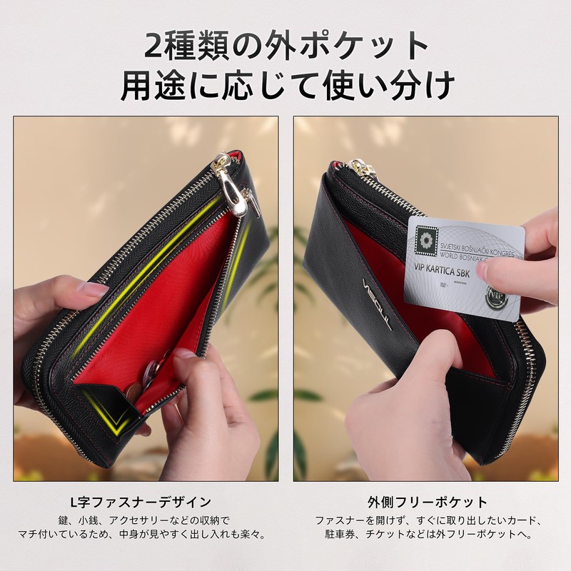 VISOUL Wallet Genuine Leather Bill Compartment, Card Coin Purse, 2-fold, Skimming Prevention, License Holder, Large Capacity, Popular, Made by Leading Leather Artisans with L-Shaped Zipper, black red
