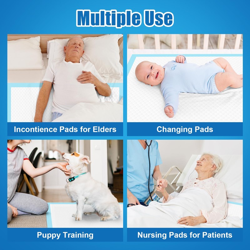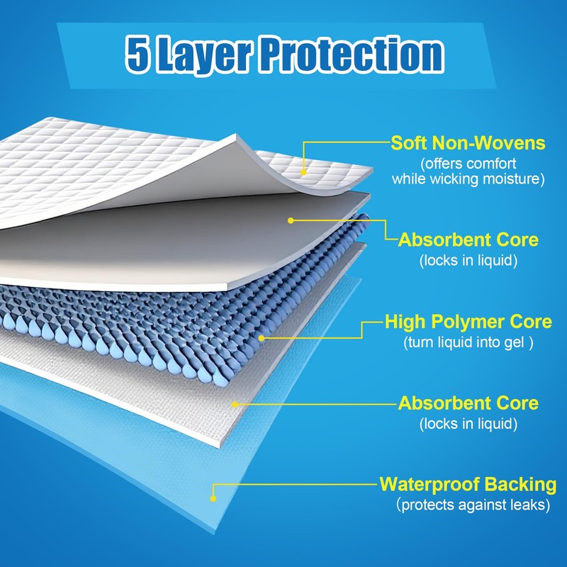 - 5-Layer Premium Protection: Our disposable bed pads feature a reinforced 5-layer design (quilted top sheet + absorbent core + waterproof backing) to prevent leaks, protect mattresses, and keep skin dry. Ideal for adult incontinence, postpartum care, elderly care, and dog training
