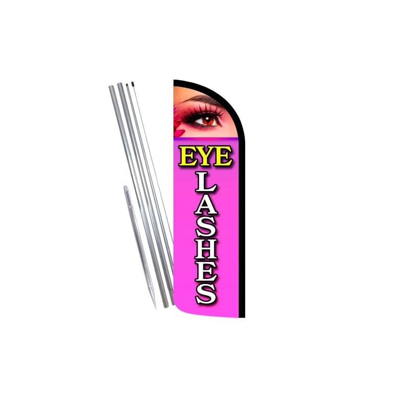 OurEyelashes Premium Windless 3 x 11.5 ft feather flag is a standard size that comes with a 4 piece hybrid fiberglass and aluminum flag pole and a steel ground mount stake. It is made of high-quality polyester fabric that is fade-resistant. It has a single-sided print that is visible from both sides, and a hemmed edge that prevents fraying. It also has a reinforced sleeve that slides over the pole and can secure with a hook and loop fastener.