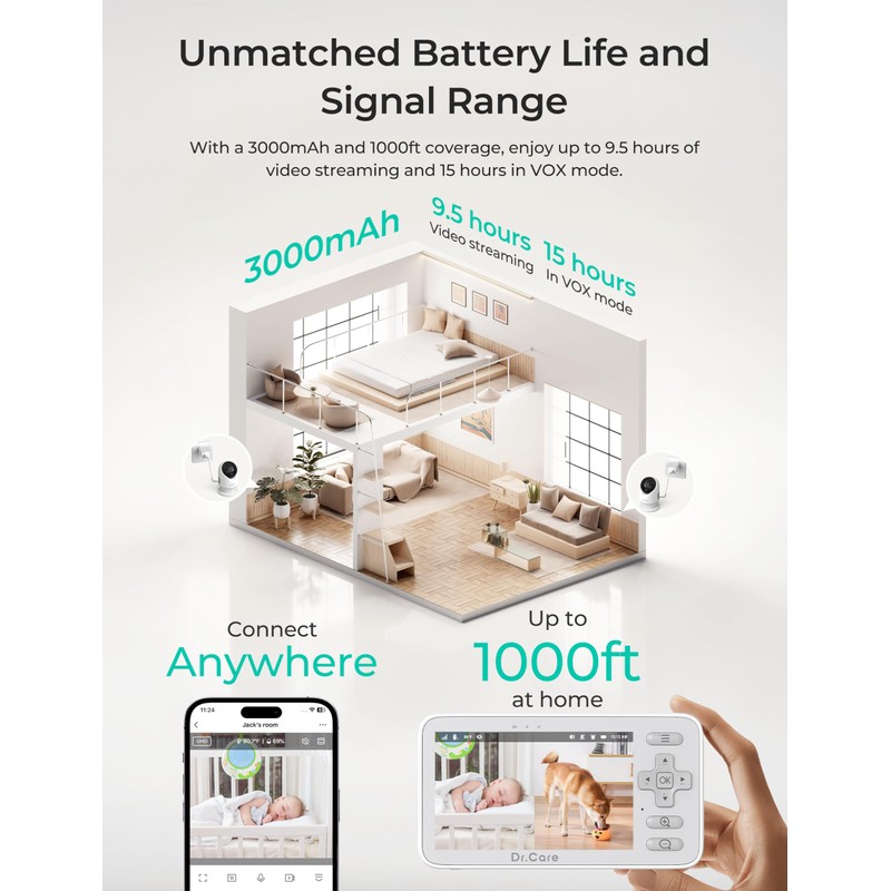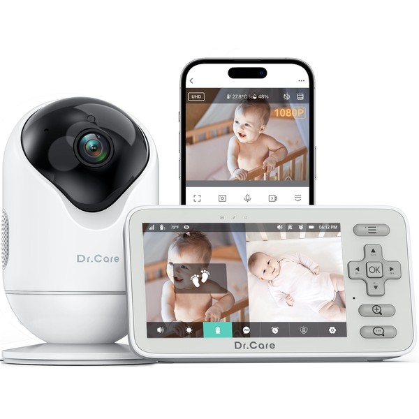 Dr.Care VistaView Lite Smart WiFi Baby Monitor - 4” 720P Split Screen & 1080P Camera App Control, Motion Alerts, HD Night Vision, 3000mAh Battery, 2-Way Talk, Multi-User, Triple Security, 1000ft Range