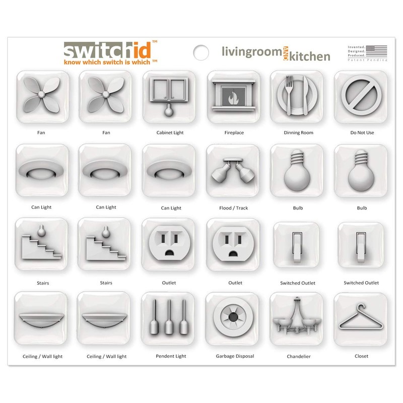 Eliminate confusion with SwitchID light switch labels and light switch stickers used to identify household appliances. SwitchIDs are high-quality product enhancements to your home! This SwitchID edition is specifically designed for your Living Room and Kitchen areas. It includes options for typical switches you find in this area if your home, Airbnb or VRBO.