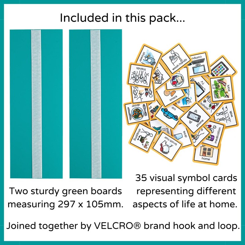 • This is a visual wall planner, or daily routine chart, of 35 picture cards plus two foamex boards which attach to one another using VELCRO Brand hook and loop. The visual schedule can display up to 10 cards at once and these can easily be changed around thanks to the VELCRO Brand hook and loop stuck to the back of the cards and the boards.