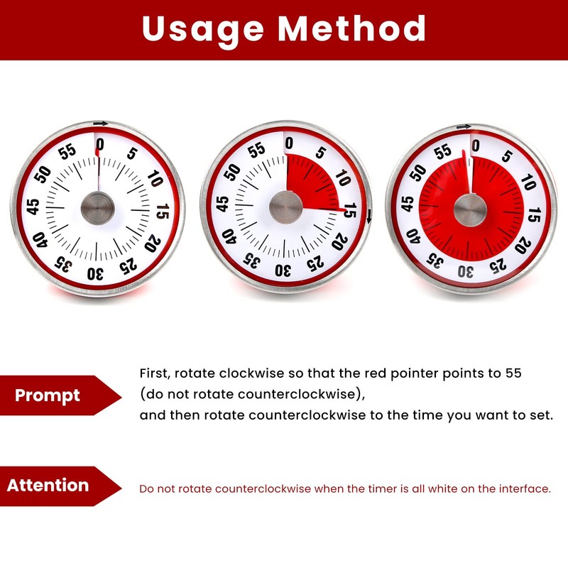 During the use of the timer, the red area on the dial will be reduced so that the passage of time can be seen. When the time is up, there is an alarm of 72 decibels for 3-5 seconds, which makes the passage of time audible.
