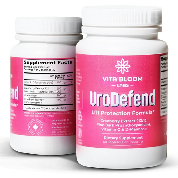Vita Bloom Labs UroDefend UTI Protection Formula | Cranberry PACs | Physician Formulated | Additive Free + Gluten Free | Cranberry Extract, Pine Bark Extract, D Mannose, Vitamin C | 60 Capsules