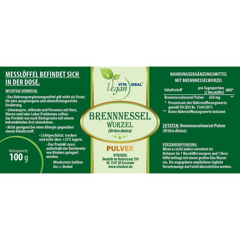 VITA IDEAL Vegan® Burning Nettle - Root 100 g Powder - Urtica Dioica - Daily Serving 650 mg Nettle Root, Natural, Vegetable & No Additives, Includes Measuring Spoon