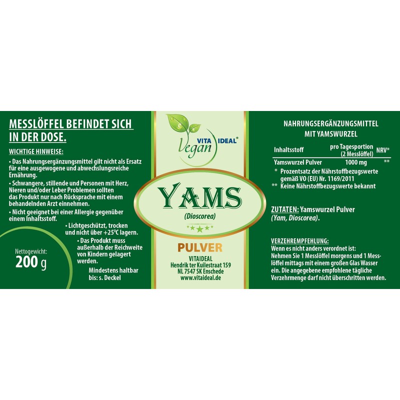 VITA IDEAL Vegan® Yams - Root 200 g Powder - Dioscorea - Yam Root - Daily Serving 1000 mg YAM Root, Natural, Vegetable and No Additives, Includes Measuring Spoon