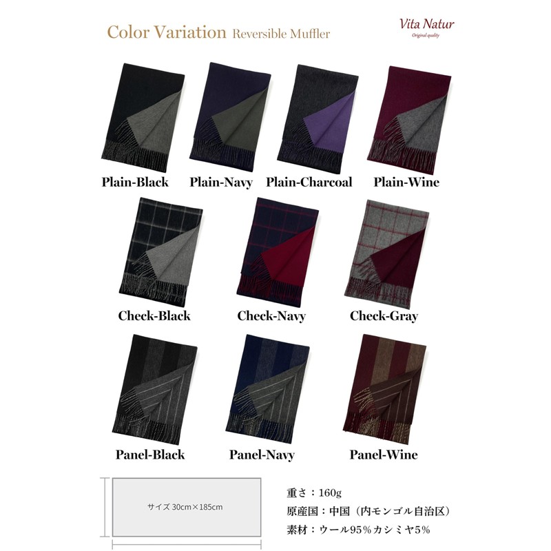 Vita Natur: Cashmere Blend Wool Reversible Scarf, 95% Wool, 5% Cashmere, Men's, Reversible Scarf (72.8 x 11.8 inches (185 x 30 cm), Available in 10 Colors Perfect as a Gift, plaid-grey