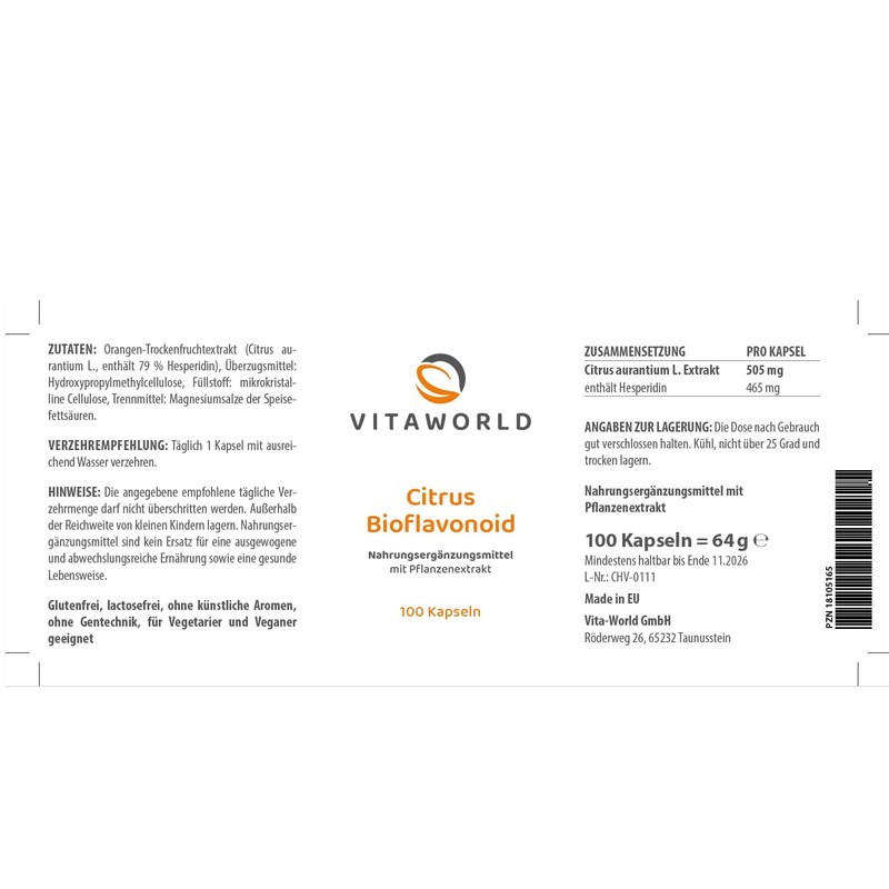 Vita World Citrus Bioflavonoid 100 Capsules Vegan 100% Hesperidin Pharmacy Manufacture