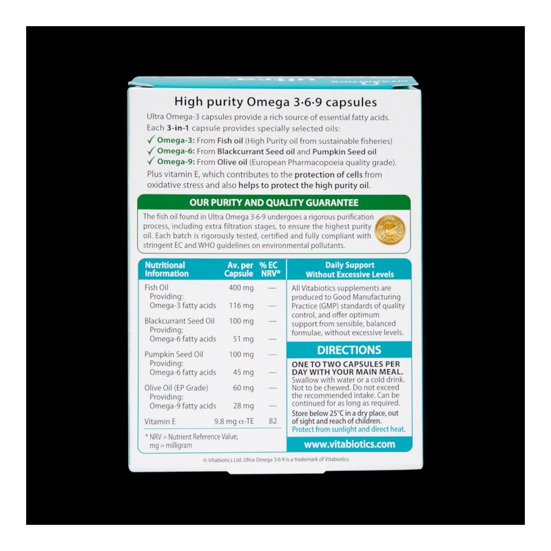 Ultra Omega 3-6-9 from Vitabiotics provides a rich source of essential fatty acids derived from a blend of expertly selected, high purity oils to help safegaurd your daily intake.