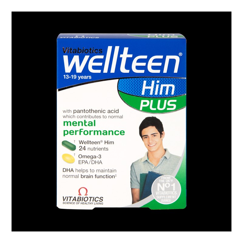 Wellteen Him Plus provides the original Wellteen Him comprehensive range of vitamins, minerals, Co-Q10 and L-Carnitine plus a high purity Omega-3 capsule. Omega 3 provides DHA which helps to maintain normal brain function*. *A beneficial effect is obtained with a daily intake of 250mg of DHA.