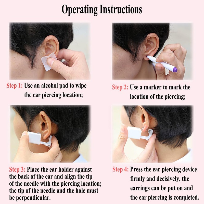 - ?Easy to Use?The lightweight body allows for better ear piercing. Hold both ends of the piercing gun, align the tip of the earring perpendicular to the mark on the ear, and then press quickly without hesitation, release your hand when you hear the ?lick?the tip of the needle will pass through the ear, and the ear piercing is complete. Detailed operation can refer to the main picture inside the use of pictures