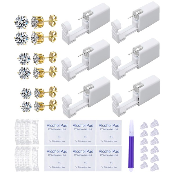 - ?Pack includes?6 pcs ear piercing gun, 6 pcs gold studs in 3 sizes (pre-installed in ear piercing guns, two each of 3mm + 4mm + 5mm cubic zirconia ), 1 marker pen, 6 alcohol pads, 6 Pcs Disposable Waterproof Ear Covers, 12 silicone earring backings(6 small+6 large). Meet the conditions for do-it-yourself ear piercing and wear beautiful earrings to add to your beauty