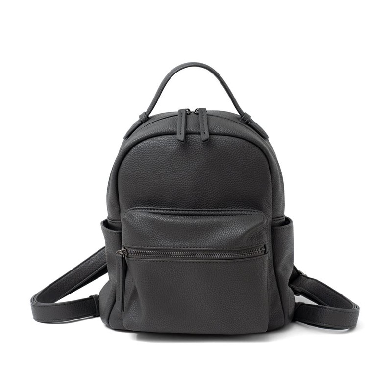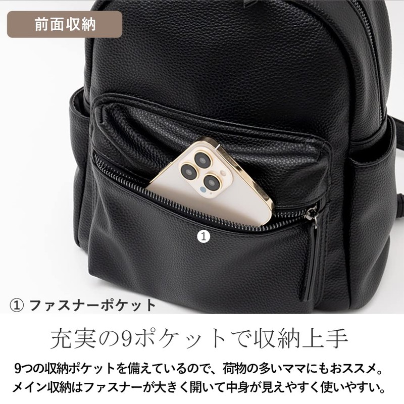 - A backpack with a size and form that is easy for women to carry. Made of soft faux leather with a grain and black nickel hardware for a mature and cool look. Simple and elegant design with plenty of pockets. Large capacity with 9 pockets to store your belongings in sort. It comes with a moderate handle so it does not get in the way on the train, making it great for commuting to work or school. The size is not too big, so it is easy to use even for petite women. It has plenty of storage space, so it is recommended as a diaper bag