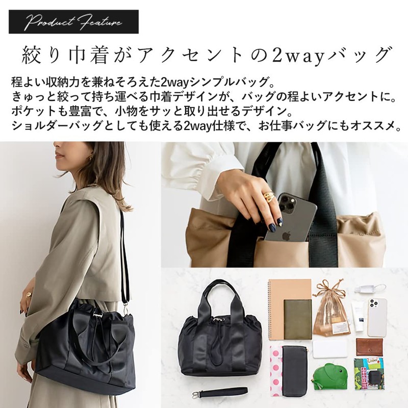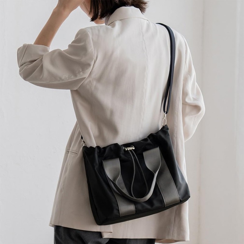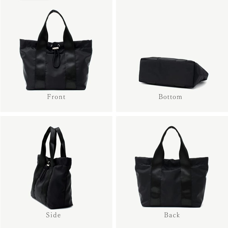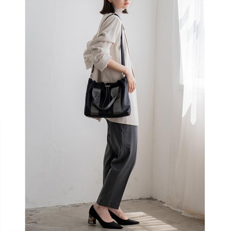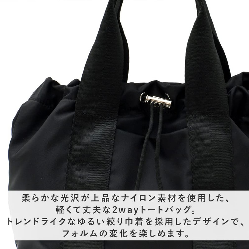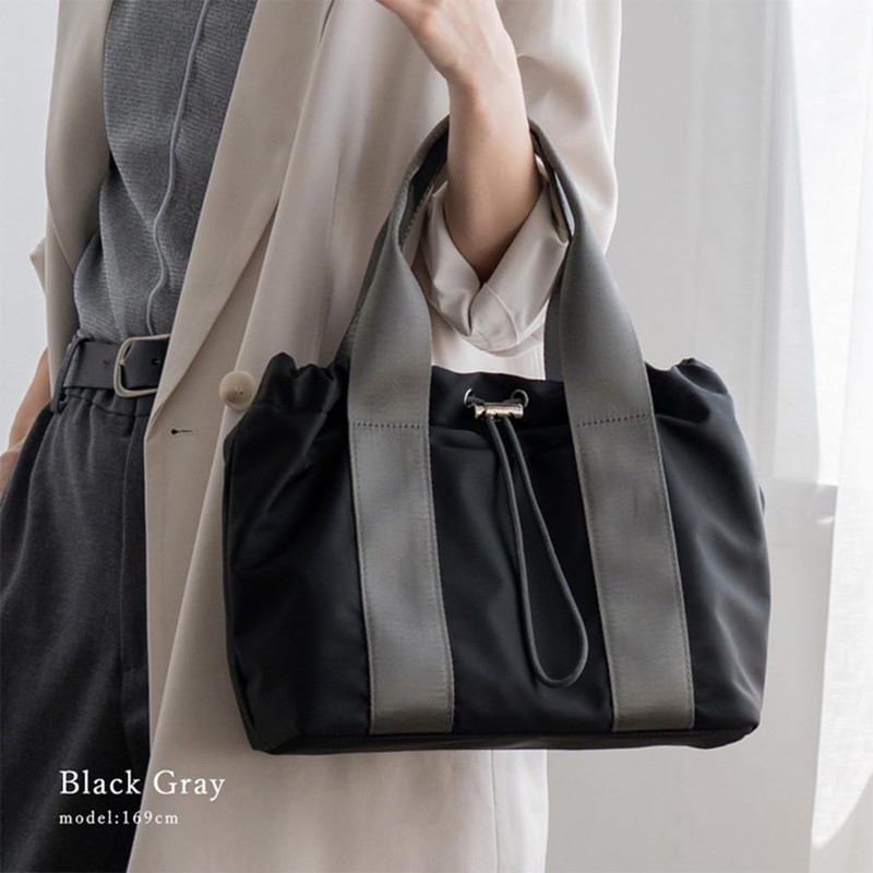 - This tote bag is made with a drawstring accent that is just the right size and has a cute form. Made of high density nylon that is resistant to abrasion, giving it an elegant and mature look. The opening part has a drawstring design, so you can enjoy the form according to your luggage. There are plenty of pockets and the design allows you to quickly access small items. The tape connected to the handle makes the bag look neat and accent. The included shoulder strap can be worn over the shoulder or across the body. You can use it according to your outfit and the occasion