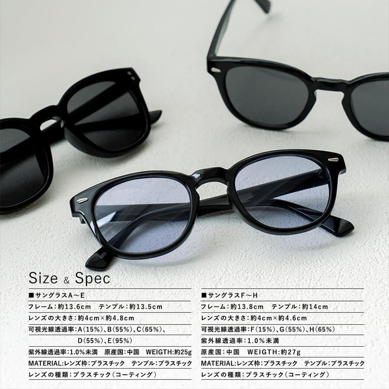 - ■Detail A (Frame: Black/Lens: Smoke) B (Frame: Black/Lens: L Gray) C (Frame: Black/Lens: L Brown) D (Frame: Black/Lens: L Purple) E (Frame: Black/Lens: Clear) ● Frame: Approx. 13.6cm ● Temple : Approx. 13.5cm ● Lens Size: Approx. 4cm x Approx. 4.8cm ● Visible Light Transmittance: A (15%), B (555%), B ), C (65 %), D (55%), E (95%); UV Transmittance: Less than 1.0%; Country of Origin: China; Weight: Approx. 0.9 oz (25 g); Material: Lens Frame: Plastic, Temple: Plastic, Lens Type: Plastic (Coating)