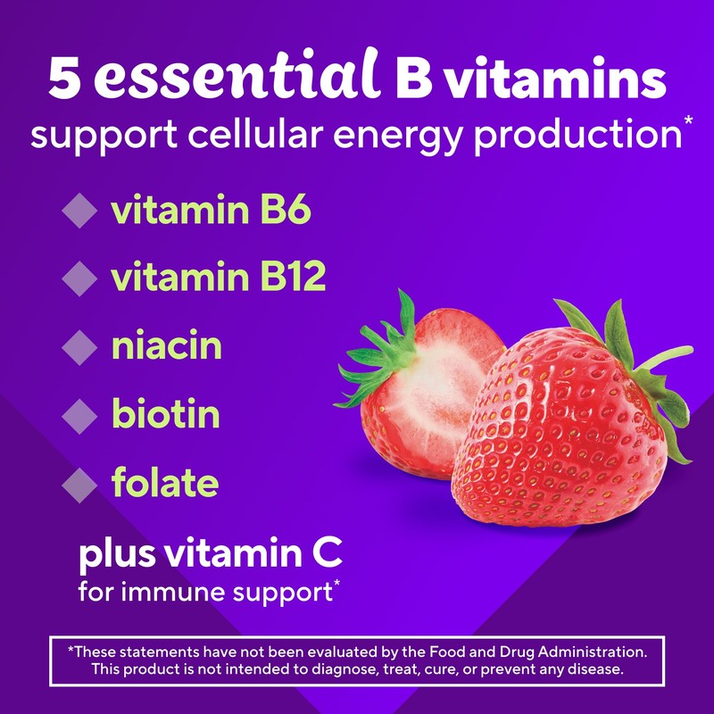 - 60-count bottle of vitafusion B-Complex gummy vitamins with 5 essential B vitamins to support cellular energy production (1), plus Vitamin C, in a delicious Strawberry flavor; 60-day supply