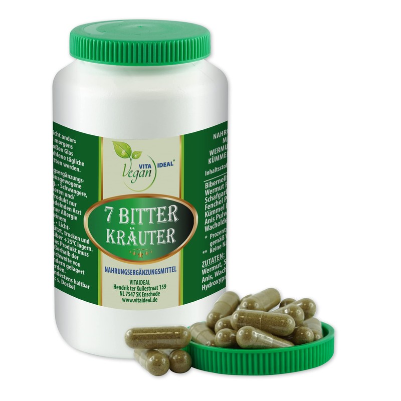 Vitaide Vegan® 7 Bitter Herbs 180 Vegetable Capsules, 470 mg Each Powder Ground of Beaver Root Wormwood, Yarrow, Fennel, Cumin, Anise, Juniper Berries, Pure Natural without Additives