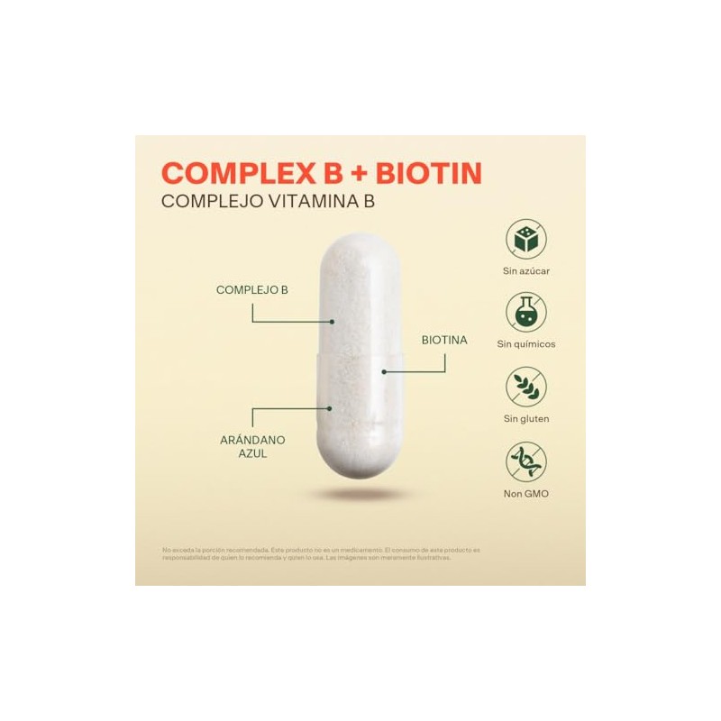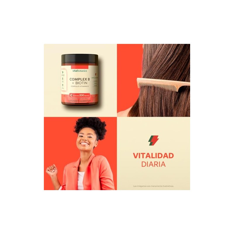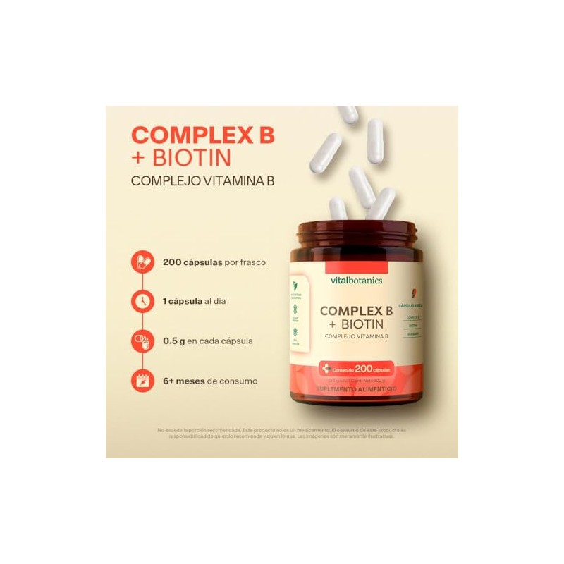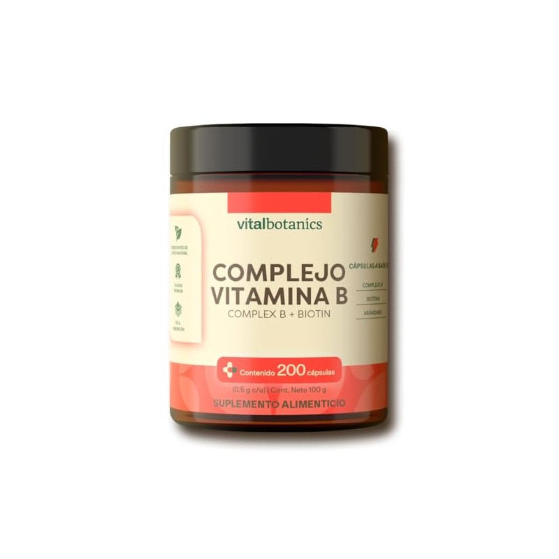 VITAL BOTANICS - Complejo B Con B1, B2, B3, B5, B6, B12, Biotina, Niacina Y Arndano - 200 Cpsulas De 500 Mg - 6 Meses De Suministro - Multivitamnico