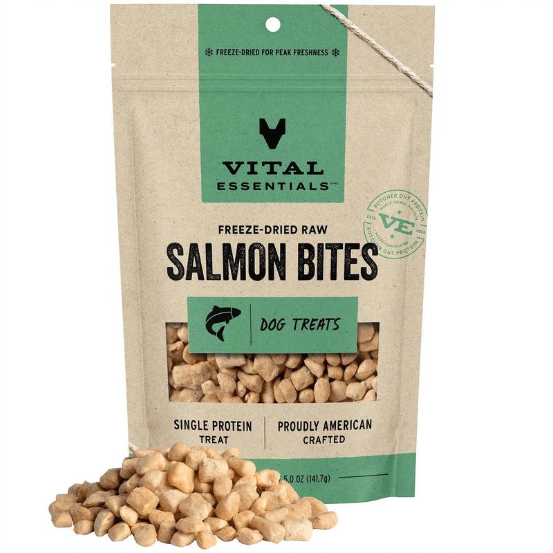 - FREEZE-DRIED RAW SALMON DOG TREAT: Vital Essentials Freeze Dried Dog Treats pack more protein than industry standard into every bite to deliver the peak vitality your dog deserves. Our natural freeze-dried raw dog treats are made from responsibly sourced, premium butcher cut salmon.