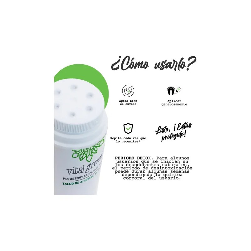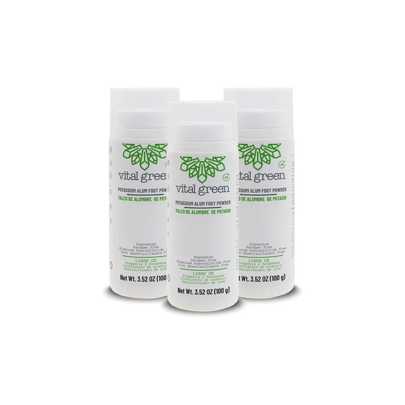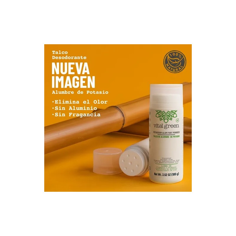 Vital Green Talco Desodorante Natural de Piedra Cristal Alumbre – Sin Aluminio ni Parabenos – Elimina el Crecimiento de Hongos en los Pies y Zapatos - Uso Corporal o Pies - 100gr - 3.53oz (Paquete 1 unidad)