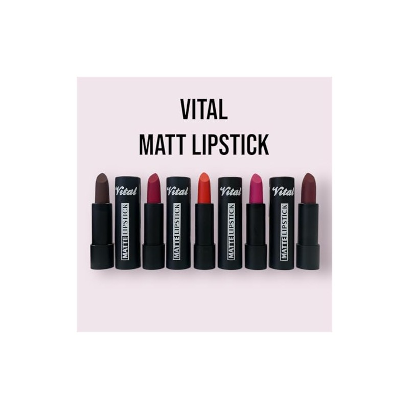 Introducing Vital Matte Lipstick, your new everyday essential for bold beauty, powerful color, and ultimate confidence. This premium lipstick collection features 27 rich, velvety shades that are designed to suit every skin tone, every occasion, and every personality. Whether you're going for a soft natural look, a fierce red carpet moment, or something daring and unique — Vital has you covered.