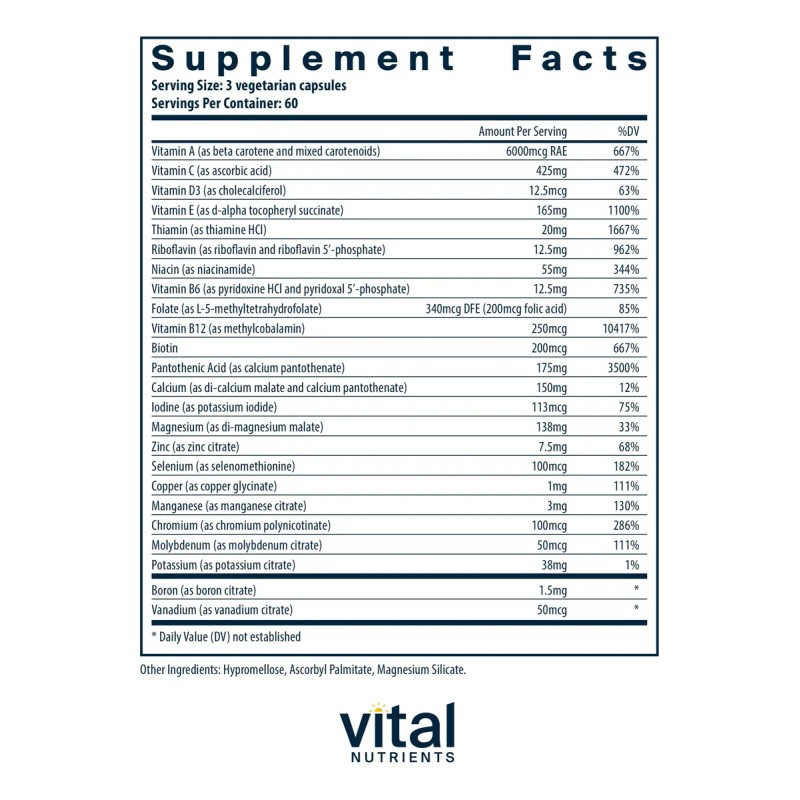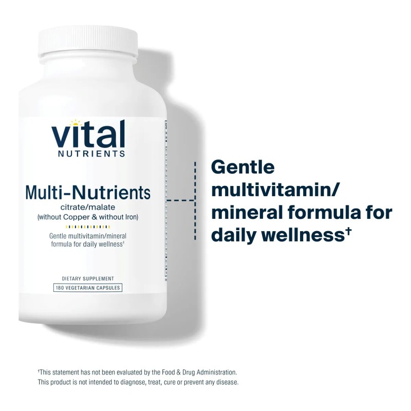 - Multivitamínico Metilado de Espectro Completo para Hombres y Mujeres: Vital Nutrients Multi-Nutrientes 3 Fórmula Citrato Malato es un multivitamínico completo formulado sin Hierro y cobre para mayor flexibilidad Este suave multivitamínico para el bienestar diario está hecho usando nutrientes en forma de citrato/malato, así como formas de vitaminas biodisponibles para una absorción óptima