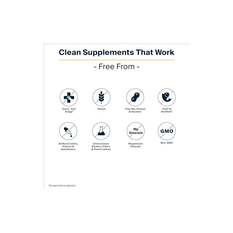 - Clean Vegan Formula: Free from gluten, dairy, peanut, tree nut, fish, shellfish, soy, sesame, and egg Non-GMO Made without artificial fillers, coatings, binders, or colors