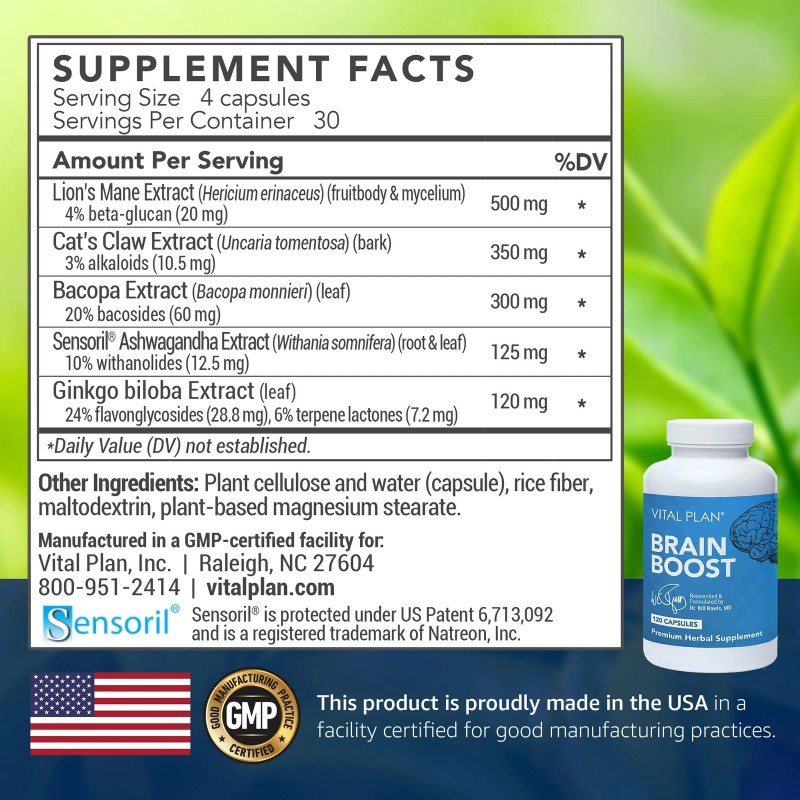 - SUPPORT OPTIMAL COGNITIVE PERFORMANCE & MOOD: Vital Plan’s Brain Boost Supplement is formulated with Lion’s Mane, Ashwagandha, Ginkgo Biloba, Bacopa, and Cat's Claw to promote cognitive function, memory, focus, energy, a positive overall mood, and increased resilience to stress.*
