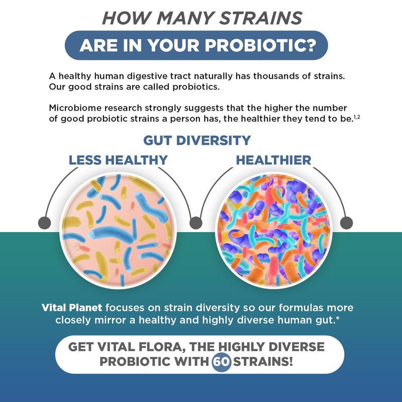 - Diversity Matters - A healthy gut contains a highly diverse balance of good probiotics. To more closely match this natural diversity, Vital Flora probiotics contain 60 different Lacto and Bifido strains. Our Men 55+ Daily formula contains more replenishing, colon-friendly Bifidobacteria known to naturally decline with age.