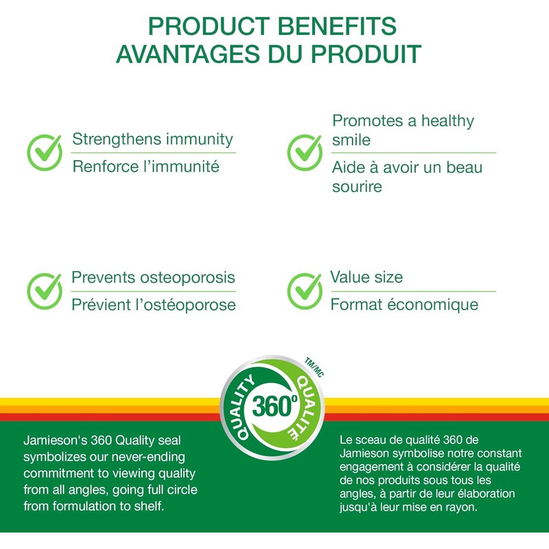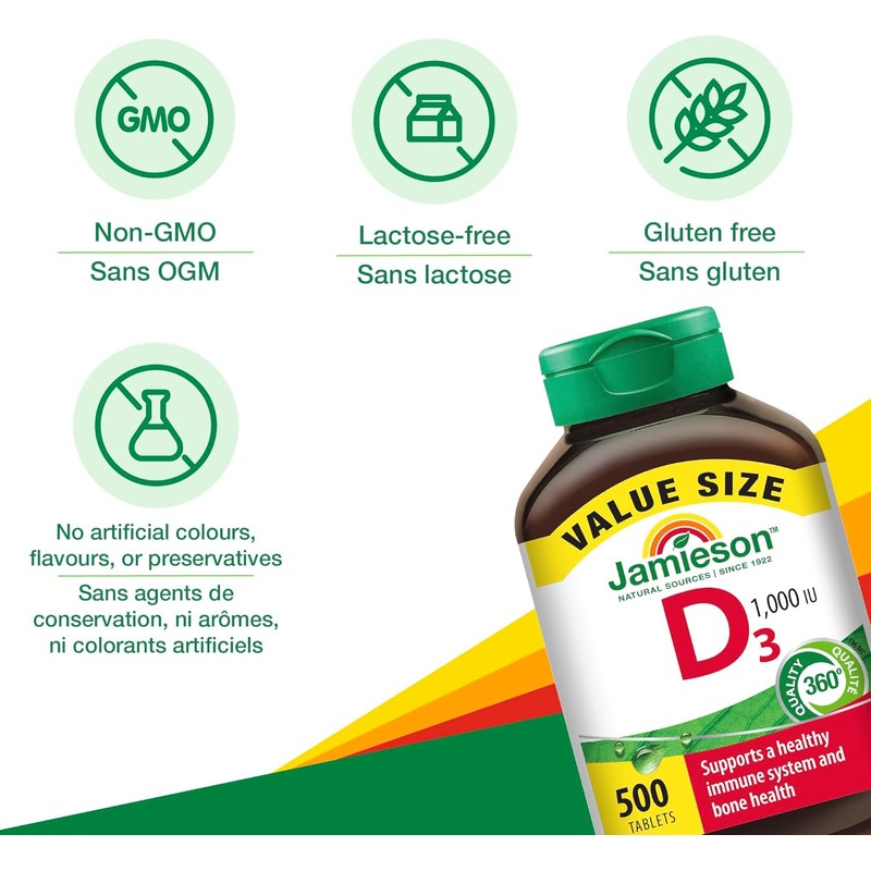 - PREVENT VITAMIN D DEFICINCEY: It can be difficult to receive enough vitamin D from sunshine and diet alone. Supplement with Jamieson Vitamin D that is packed with 1000 IU of Vitamin D per tablet