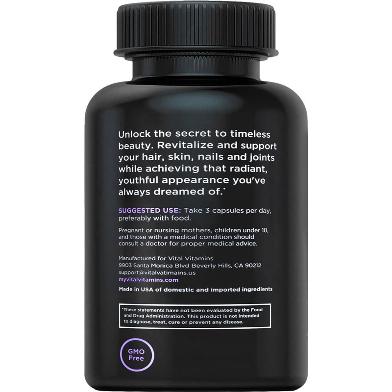 Vital Vitamins Multi Collagen Complex comes in convenient capsules, making it an effortless addition to your daily routine. Unlock the secrets of collagen, biotin, and hyaluronic acid and invest in your health and confidence today.