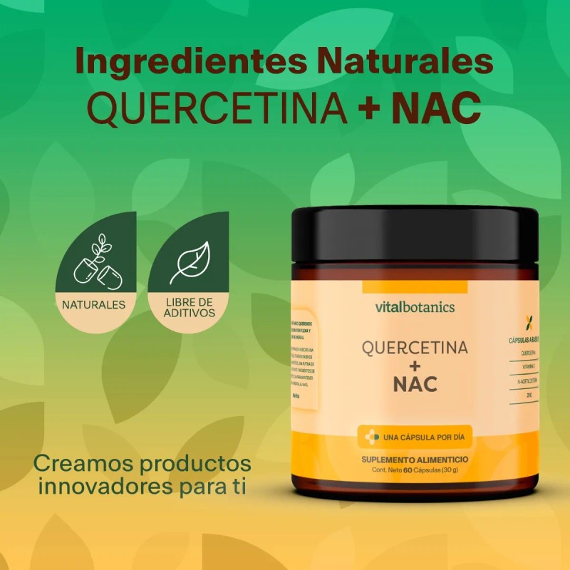 El suplemento Quercetina + NAC de VitalBotanics combina 4 poderosos ingredientes que trabajan en sinergia para brindar un apoyo integral al sistema inmunológico, la salud celular y la protección antioxidante. Cada cápsula está diseñada para fortalecer las defensas del cuerpo, mejorar la respuesta ante agentes externos y promover el bienestar general.
