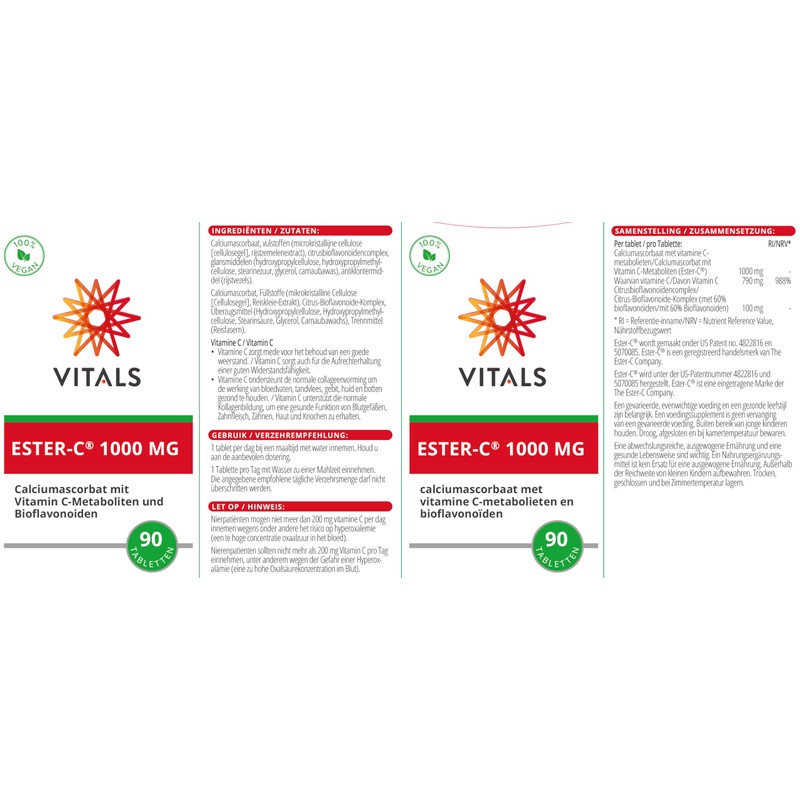 Vitals - Ester-C, 1000mg Superior Form of Vitamin C, 90 Tablets Calcium Ascorbate with Vitamin C Metabolites and Bioflavonoids. 100% Vegan.