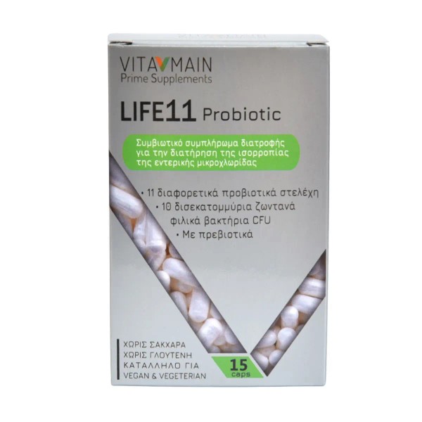 Vitamain Life 11 Probiotic is a food supplement combining 11 different strains of friendly bacteria (probiotics) from the families Lactobacillus, Bifidus, and Streptococcus, for a balanced intestinal flora and good digestive health.