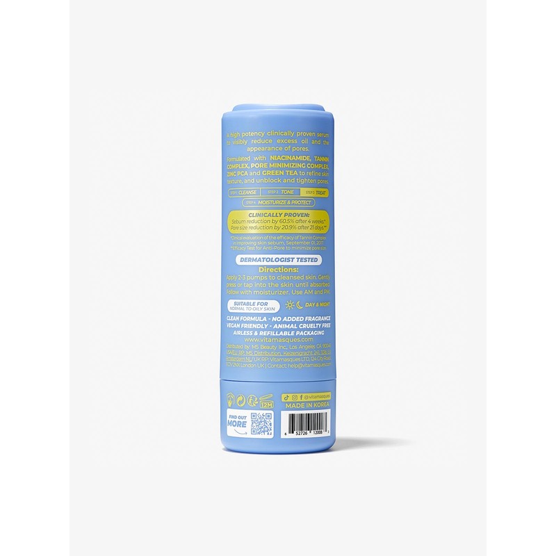 Minimize the appearance of pores and help reduce oily skin with the Pore Control niacinamide serum from Vitamasques. It reduces excess sebum production, helping you to control outbreaks of acne for everyday confidence! Benefits Pore Minimizing - Reduces the appearance of pores. Sebum Control - Regulates excess oil production. Acne Control - Helps in controlling outbreaks. Soothing - Calms and protects the skin. Texture A slightly opaque, lightweight serum that provides a fresh and mattifying finish. Packaging Convenient dropper bottle for precise application and minimal wastage. Sleek, modern design for easy application and portability.