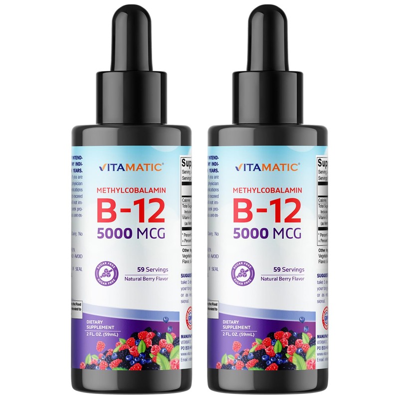 Vitamatic 2 Packs Fast Acting Liquid Vitamin B12 5000 mcg (Methylcobalamin) - Natural Berry Flavor - Sublingual Supplement - Faster Absorption - 2 OZ