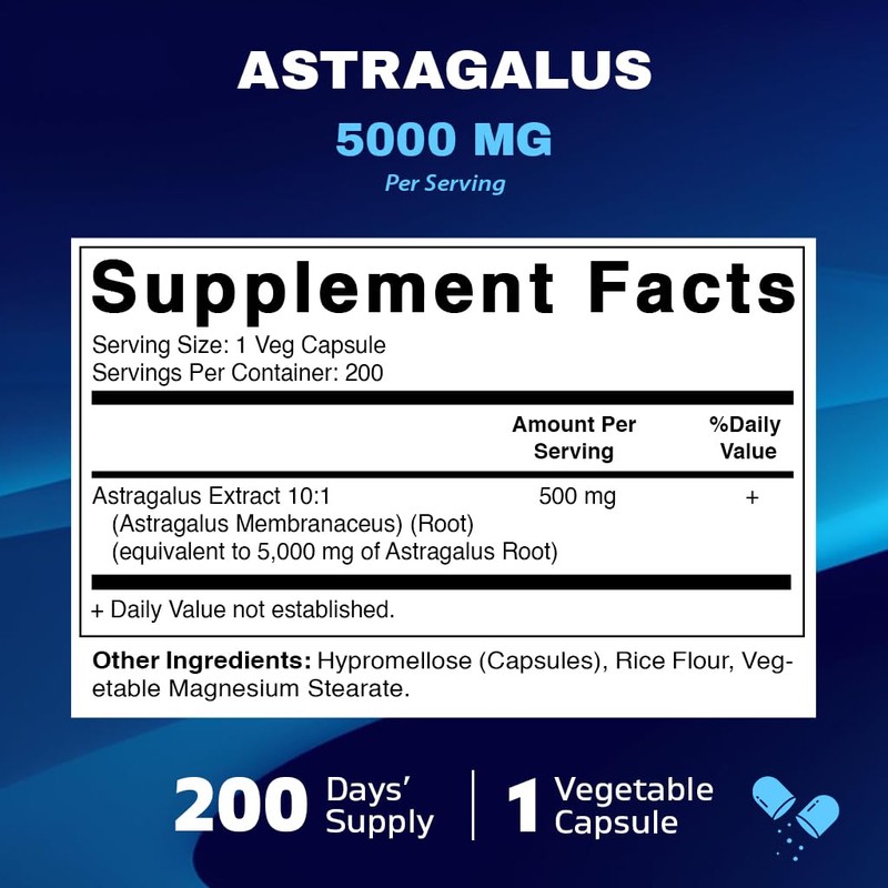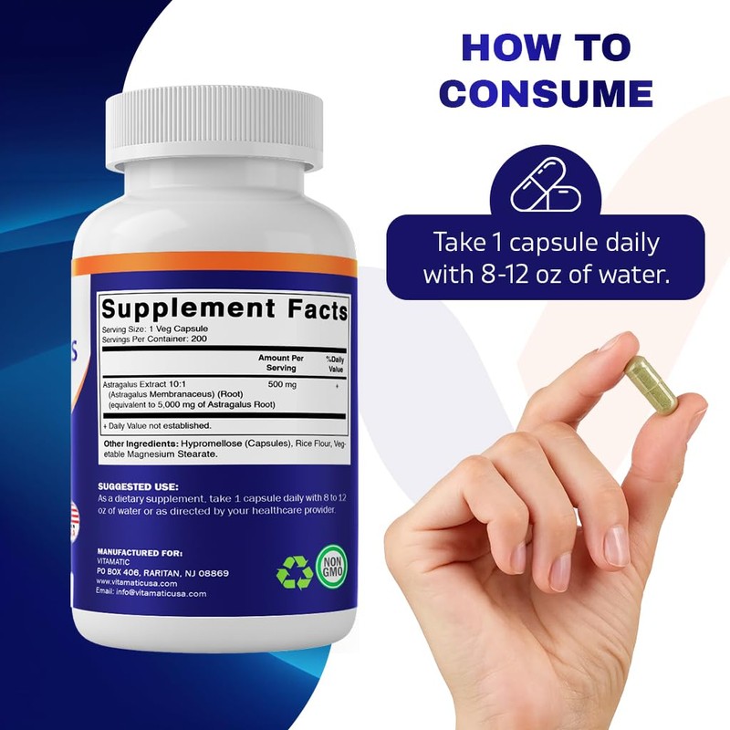 Vitamatic Astragalus Capsules 5000mg Supplement - 200 Veg Capsules - 10:1 Astragalus Extract 500mg Equal to 5,000mg Astragalus Root Powder - Non-GMO, Gluten-Free