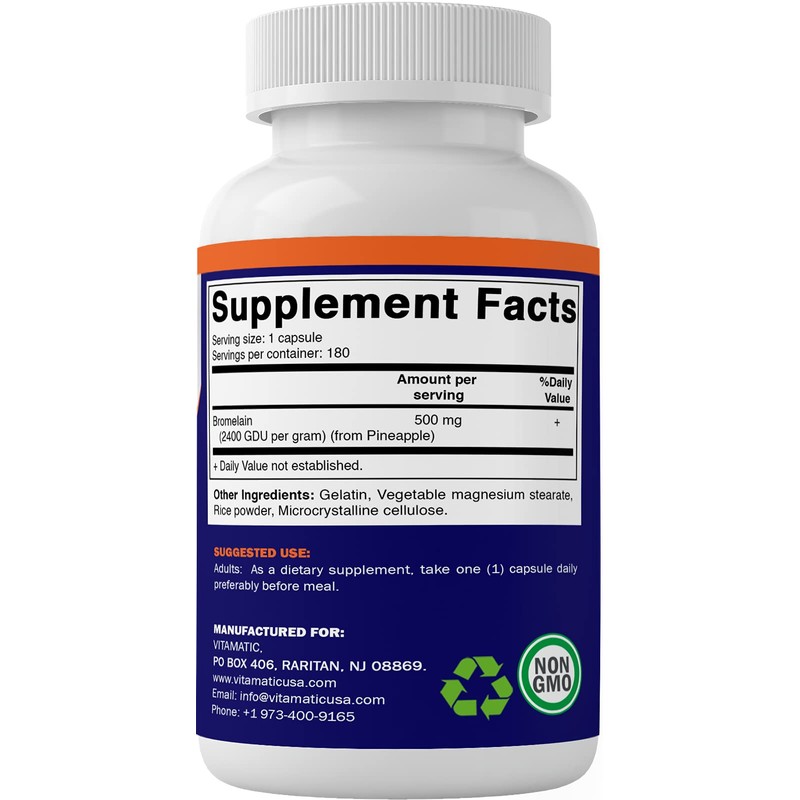 Vitamatic Bromelain Supplement 500mg, 2400 GDU/g, Proteolytic Enzymes, Supports Digestion of Proteins, 180 Count