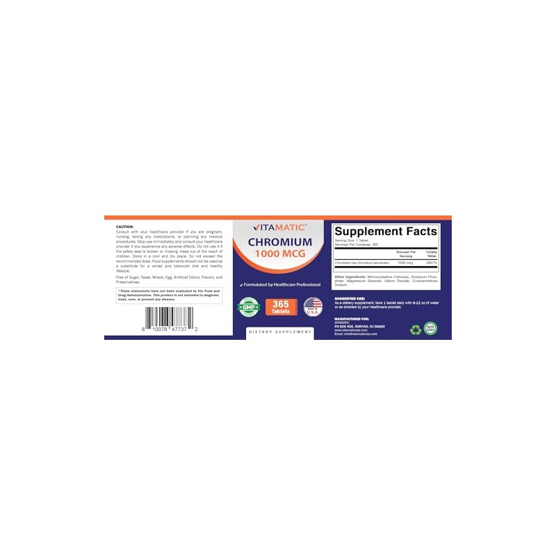 Vitamatic Chromium 1000 mcg | 365 Tablets | High Potency Chromium Picolinate | Non-GMO, Gluten Free