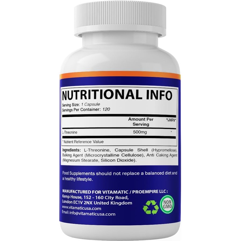 🌿💊 Vitamatic L-Threonina – 120 Cápsulas | Aminoácido Esencial para la Salud del Hígado, Sistema Inmune y Bienestar General | Sabor Neutro