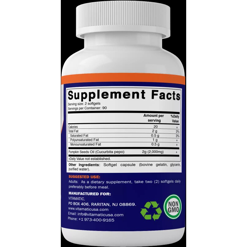 Vitamatic Pumpkin Seed Oil 2000mg Softgel Capsules per serving - 180 Softgels