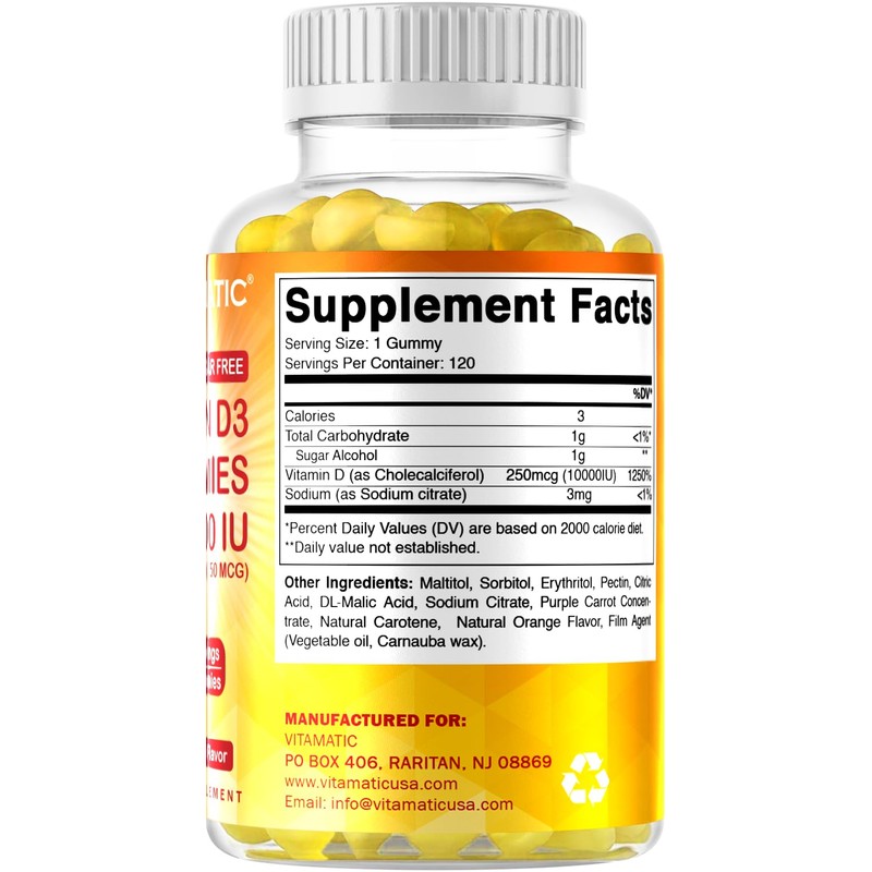Vitamatic Sugar Free Vitamin D3 10000 IU - 120 Pectin Based Gummies - Great Taste - Healthy Bones, Mood & Immune System Function - Non-GMO - 120 Servings