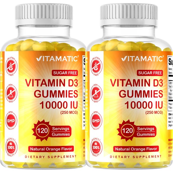 Vitamatic Sugar Free Vitamin D3 10000 IU - 120 Pectin Based Gummies - Great Taste - Healthy Bones, Mood & Immune System Function - Non-GMO - 120 Servings - 2 Pack